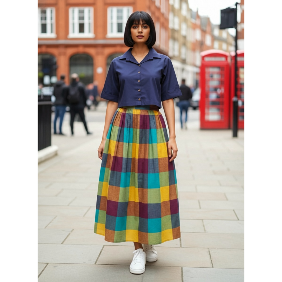 Discover a trendy women's outfit featuring a colorful checked long skirt paired with a navy crop shirt and white sneakers. Perfect for casual outings, street style fashion, and modern everyday wear. Shop stylish women's skirts and tops for a chic and comfortable look.